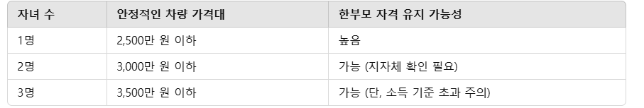 일부 지자체는 차량 가격이 3,000만 원을 초과하면 한부모 자격 유지가 어려울 수도 있으니 거주지 주민센터(복지 담당)에 문의하여 정확한 기준을 확인하시기 바랍니다.