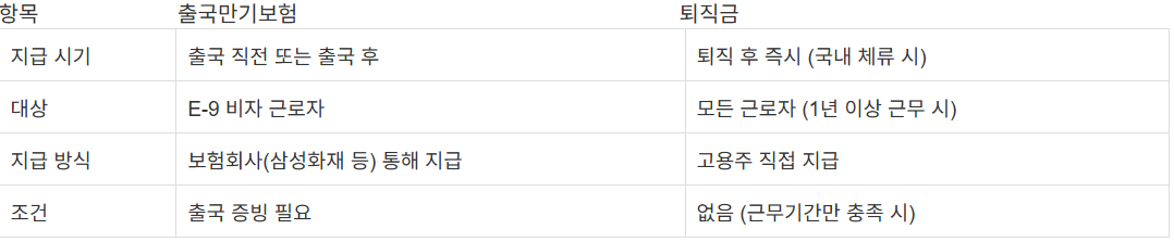 즉, 출국만기보험은 퇴직금의 일부 보완 또는 대체 개념으로 운영됩니다.