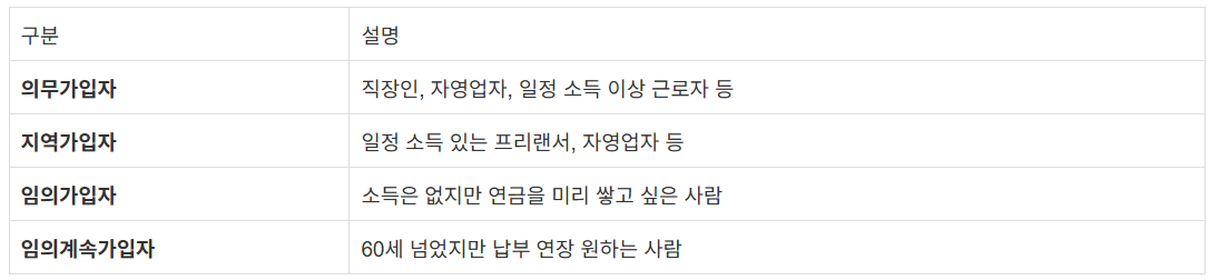 국민연금은 노후에 연금을 받을 수 있도록 소득이 있을 때 미리 보험료를 납부하는 제도이며 만 18세 이상 ~ 60세 미만 국민 중 일정 소득이 발생하면 의무가입 대상이 되며 연금 수령을 위해서는 10년 이상 가입이 필요로 합니다.